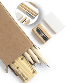 Kit Escritório sustentável, composto por 3 lápis de bambu reciclado, 1 apontador de bambu reciclado, 1 régua de bambu reciclado de 15 cm e 1 borracha. Ideal para quem busca praticidade e respeito ao meio ambiente no dia a dia.