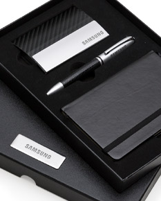 Kit executivo 3 peças. Acompanha: porta cartão de couro sintético texturizado com detalhes prata, caneta metal fosca com detalhe emborrachado preto, caderneta tipo moleskine em couro sintético com aproximadamente 80 folhas amarelas pautadas.