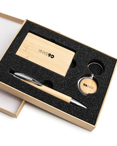 Este kit é a escolha perfeita para quem busca sustentabilidade no dia a dia. Ele inclui: um porta-cartão com tampa de bambu e interior em metal brilhante, combinando resistência e sofisticação; um chaveiro giratório em metal com frente de bambu e verso espelhado, trazendo modernidade; e uma caneta de bambu com clipe metálico, acionamento por clique e carga esferográfica azul, prática e estilosa. Todos os itens são cuidadosamente acomodados em um estojo de papelão com tampa e interior de espuma, ideal para presentes ou para organizar seus itens com cuidado. Uma escolha que alia sustentabilidade, elegância e utilidade em um único conjunto!