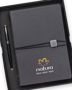 Anote tudo e organize os cartões com o nosso Kit Executivo! Ele vem com uma caneta metálica super sofisticada de 1.0mm na cor preta e um caderno fichário de aproximadamente 96 folhas removíveis, ou seja, dá para trocar, reorganizar e deixar tudo do seu jeito! Os seis anéis garantem praticidade, e a capa dura em couro sintético traz aquele toque elegante durante os registros e planejamentos. E tem mais! São quatro espaços para cartões, sendo um com visor transparente, espaço para guardar anotações, suporte para caneta e fechamento em elástico para manter tudo seguro. Para um toque exclusivo, ainda acompanha uma plaquinha para personalização e embalagem.