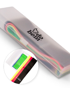 Kit com cinco faixas de borracha com diferentes níveis de resistência, oferecendo a elasticidade ideal para a prática de diversos tipos de atividades físicas. O conjunto acompanha um estojo plástico para guardar as faixas.