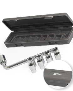 Kit de ferramentas composto por 10 peças, armazenado em um estojo plástico resistente. Inclui uma chave L e nove soquetes de diferentes tamanhos, ideal para ajustes e manutenções em geral.