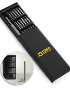 Kit ferramenta com 25 peças em estojo plástico com tampa de encaixe. Contém: 1 chave extensora rotatória para conexão das ponteiras, 1 ponteira Tri-Wing, 5 ponteiras Phillips, 4 ponteiras fenda, 10 ponteiras Torx, 2 ponteira Allen, 1 ponteira spanner e 1 ponteira fenda triangular.