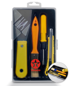 Kit ferramentas 4 peças em estojo plástico com trava de segurança. Contém chave dupla(Phillips e Fenda), estilete, pincel e espátula.