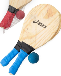 Kit frescobol com embalagem de malha plástica. Contém 2 raquetes de madeira com pegador de revestimento EVA e bolinha emborrachada.