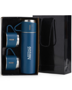 Kit garrafa térmica 450ml com duas tampas extras que podem ser utilizadas como xícaras. Garrafa produzida em inox com base antiderrapante e tampas de inox com revestimento plástico. Acompanha sacola de papel com berço de papelão para acomodação das peças.