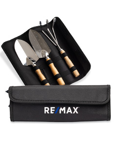 Kit de jardinagem com três peças em aço inox 410, que garante resistência e durabilidade, e cabos de madeira para melhor manuseio. Inclui ancinho de três pontas, pazinha estreita e pazinha larga. Acompanha estojo em tecido Oxford com fechamento em velcro, facilitando o transporte e a organização. Um brinde corporativo prático, funcional e sustentável.