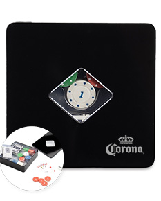 Kit poker formado por dois baralhos completos, com 54 cartas cada, além de uma ficha de dealer e cerca de 100 fichas coloridas, distribuídas em quatro cores com 25 unidades cada. Acompanha um estojo metálico para guardar os itens do conjunto.