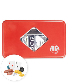 Kit poker composto por um baralho completo com 54 cartas, 100 fichas plásticas divididas em quatro cores diferentes, uma ficha de dealer e quatro dados de seis faces. Acompanha estojo metálico e folheto de regras em inglês.
