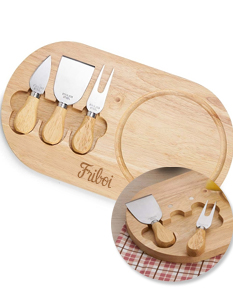 Kit queijo composto por faca reta, faca com ponta, espátula e garfo inox em uma base de madeira com ímãs.