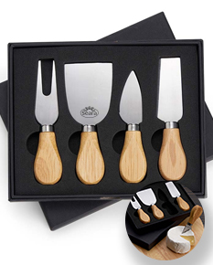 Kit queijo 4 peças em estojo de papelão com berço de espuma, contém: faca com ponta, faca reta, garfo e espátula