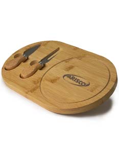 Kit queijo com 3 peças: tábua de bambu com canaleta, faca com ponta e garfo. A tábua possui ímã para encaixe e fixação dos utensílios, garantindo praticidade e organização no uso.