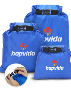 Kit com 3 sacos em nylon impermeável com fechamento por fivelas.