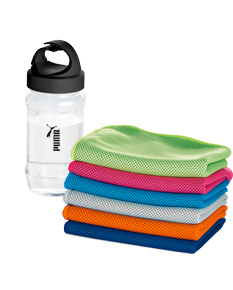 Kit toalha e garrafa. Toalha para esporte em poliamida e poliéster. Toalha refrescante, quando molhada permanece fria durante horas. Se aquecer, basta balançar reativando sua frescura. Reutilizável e lavável à máquina. Garrafa em PP e PET com mosquetão incluso (food grade). Capacidade até 440 ml.