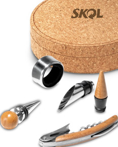 Kit vinho em cortiça. Com saca-rolhas com canivete de sommelier, gargantilha, salva-gotas com tampa e rolha