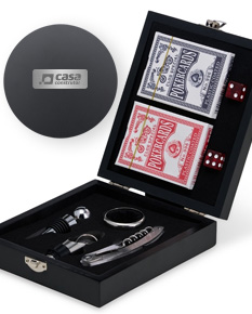 Kit de vinho elegante acompanhado de um jogo de baralho, perfeito para momentos de descontração.