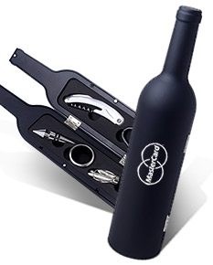 Kit vinho composto por tampa de bico, wine collar, bico condutor com tampa, saca rolhas e cortador de lacre. Acompanha estojo emborrachado em formato de garrafa.