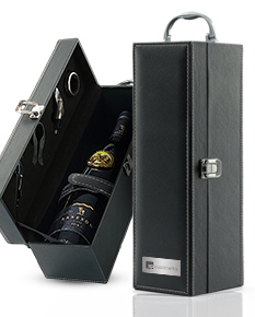 Kit vinho 4 peças em maleta de couro sintético. Contém saca-rolhas metálico, bico condutor com tampa, cortador de lacre e wine colar. Maleta com alça, trava de segurança e parte interna revestida de veludo com área de acomodação para garrafa.