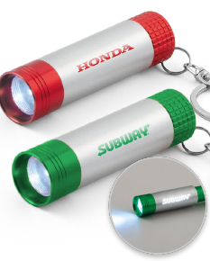 Chaveiro com lanterna integrada, produzido em alumínio e plástico, com luz LED interna. Compacto e leve, é uma solução prática para uso diário ou em ambientes com baixa iluminação.