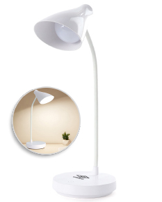 Luminária articulável em led recarregável e funcionamento touch, material plástico. Contém três estágios de iluminação com regulagem de intensidade touch: luz fria (branca), luz quente (amarela) e luz mista (branca e amarela). Base com botão para ligar e desligar. Acompanha uma bateria de lítio e cabo USB para carregamento.Aberto 40 cm