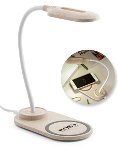 Luminária de mesa em ABS e fibra de palha de trigo com carregador wireless. A haste é flexível para ajustar a direção da luz e contém 20 LEDs que permitem uma iluminação até 3 níveis de intensidade