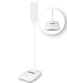 Luminária recarregável com 16 LEDs, estrutura em plástico e haste articulável em múltiplos ângulos. Possui acionamento por toque na base para a seleção de três níveis diferentes de iluminação e entrada Micro USB. Acompanha cabo micro USB para carregamento.