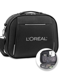 Mala de cosméticos em 600D e EVA com fecho duplo. Compartimento frontal semi-rígido e interior forrado com 2 bolsos. A mala tem uma banda para transporte em trolley de viagem e alça ajustável em webbing