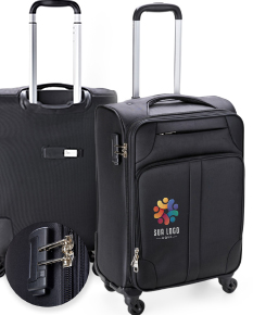 Mala de viagem executivo em ABS e 600D com 4 rodas duplas giratórias, interior forrado e pega extensível em alumínio com altura até 460 mm. Compartimento almofadado para notebook até 15.6" e 2 bolsos frontais. Contém fecho de segurança com senha na lateral. Com placa preta de personalização.