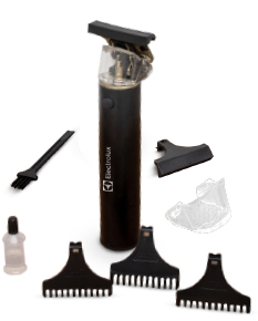Máquina de cortar cabelo recarregável com lâminas em aço inoxidável, tampa plástica e corpo de alumínio. Acompanha 4 pentes plásticos (1mm, 2mm, 3mm e pente de proteção para as lâminas), escova de limpeza, óleo lubrificante e cabo USB-Tipo-C.Máquina de Cortar Cabelo Recarregável