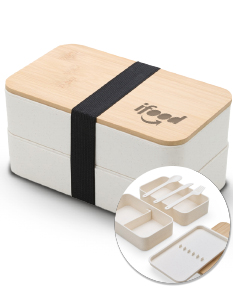 Marmita dupla em fibra de trigo, sendo um compartimento de 600ml com tampa de bambu e outro compartimento de 500ml com suporte para talheres de fibra de trigo. Possui uma divisória removível e elástico para um transporte seguro. Acompanha garfo, faca e colher. Obs: O tempo de aquecimento no micro-ondas não deve ultrapassar 3 minutos.