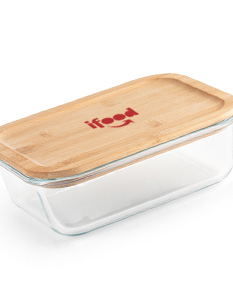 Marmita em vidro borossilicato e tampa em bambu com vedante em silicone. Apto para o micro-ondas e máquina de lavar, retirando a tampa. Capacidade até 1. Certificação EU Food Grade.