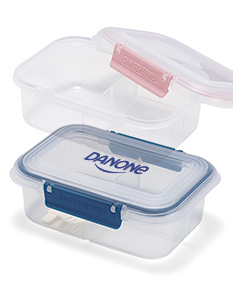 Marmita em plástico polipropileno (PP) livre de BPA com capacidade máxima de 650ml. Possui três divisórias fixas, tampa hermética com anel de vedação em silicone e duas travas laterais. Acompanha colher tipo spork em PP