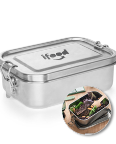 Marmita hermética robusta em aço inox 90% reciclado com fivelas laterais de segurança. Capacidade até 750 mL. Fornecida em caixa presente em papel kraft reciclado. Certificação EU Food Grade. 170 x 119 x 57 mm