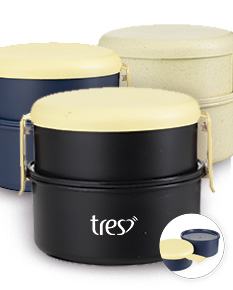 Marmita dupla em plástico livre de BPA com capacidade total de até 700ml. Apresenta dois potes em tamanhos diferentes: o menor com capacidade para 300 ml e o maior para 400 ml. Possui uma tampa para o pote inferior e outra, com travas laterais, que permite unir ambos os potes.