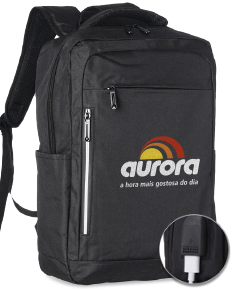 Mochila de nylon 20 litros com três compartimentos, sendo o principal com bolso para notebook 15,6. Com bolsos laterais e faixa frontal refletiva, a mochila possui adaptador USB externo, alça para encaixe em malas de viagem, duas alças de mãos e alças para as costas com revestimento espumado.