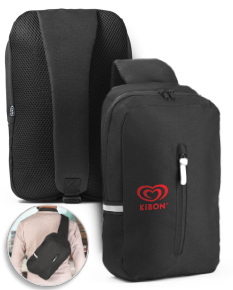 Mochila à tiracolo em 300D rPET e 600D rPET. Possui compartimento principal e bolso frontal com fecho. Contém elementos refletores e um elástico interior para transporte de garrafa. As alças e a parte posterior são almofadadas. 200 x 340 x 80 mm
