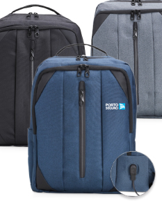 Mochila de nylon 27 litros com três compartimentos, sendo o principal com bolso para notebook 15.6 polegadas. Com divisórias internas para acessórios, bolso lateral, alça para engate em malas de viagem e suporte externo usb.