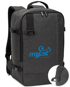Mochila em poliéster reciclado 600D com forro em poliéster reciclado 210D, acabamento repelente à água e capacidade de até 20 L. Atende às dimensões exigidas como bagagem de mão, com compartimento principal para roupas, bolso frontal e compartimento acolchoado para notebook até 14". Possui alça para trolley, pega superior almofadada e cintas de compressão laterais.