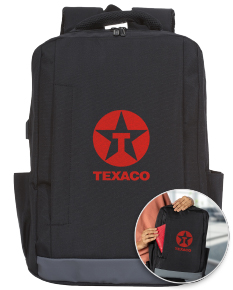 Mochila de nylon de 27 litros, com compartimento principal com bolso para notebook 15.6 polegadas, possui divisórias para documentos e caneta, compartimento frontal com abertura vertical, bolsos laterais com revestimento interno emborrachado e dispositivo com entrada USB na parte externa, seu cabo USB acoplado internamente permite a conexão de um carregador portátil na área interna e a conexão de um eletrônico na área externa, viabilizando a carga e utilização do eletrônico enquanto caminha. Contém zíperes preto, faixa emborracha na área inferior frontal, alça horizontal para encaixe em malas de viagem, alças para costas ajustáveis com revestimento anti-transpirante e duas alças de mãos em nylon, sendo uma delas com revestimento interno.