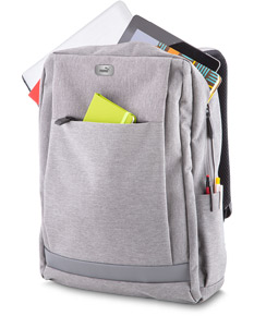 Mochila antirroubo em poliéster reciclado 600D com detalhes em PU e interior em poliéster reciclado 210D. Resistente à água, conta com compartimento principal com bolsos almofadados para notebook até 17.3" e tablet até 10.5", além de compartimentos laterais e frontais. Parte traseira acolchoada, pega superior e alça para trolley. Capacidade até 20 L.