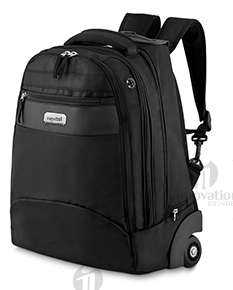 Mochila executiva com rodinha confeccionada em tecido nylon e polyester com detalhe em couro sintético. Possui um bolso frontal, dois compartimentos internos, um bolso interno e porta notebook, com porta cartão e porta canetas, com alça de mão e alças para as costas com espuma. Bolso traseiro para guardar as alças e tecido protetor de sujeira.