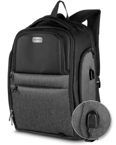 Mochila de Nylon 22 Litros com 4 compartimentos, sendo o principal com bolso para notebook 15,6. Com divisórias internas para acessórios, a mochila possui bolso lateral, suporte externo USB e alça para engate em malas de viagem.