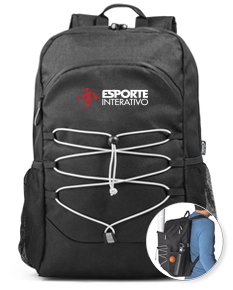 Mochila para notebook em 300D e 600D, ambos em poliéster reciclado (100% rPET) com elementos refletores. Possui 1 compartimento principal com 1 bolso multifuncional e bolso para notebook portátil até 15.6". Bolso frontal com zíper, 2 bolsos laterais em tela mesh e um elástico na frente para transporte de diferentes objetos. A parte posterior e alças são almofadadas. Capacidade até 18 L. 320 x 450 x 140 mm