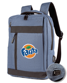 Mochila para notebook em poliéster, com alças de mão e de ombro acolchoadas. Possui dois bolsos frontais com zíper e um conector USB lateral. Internamente, conta com compartimento dedicado para notebooks de até 15,6".
