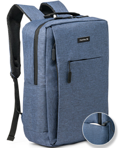 Mochila para notebook em 300D com placa de personalização. Tem 1 compartimento principal com bolso forrado para notebook até 15,6" e diversos bolsos interiores. Contém ainda bolso frontal, lateral e entrada USB. Parte posterior e alças são almofadadas