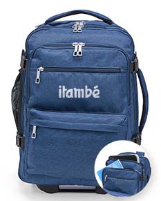 Mochila de 17L feita em poliéster impermeável, com alça retrátil em metal, botão e freios em plástico. Possui diversos bolsos: dois frontais, um lateral em tela, um interno em tela e um superior para guardar a alça. Pode ser usada nas costas ou como mala de mão, com alças superior e lateral reforçadas.