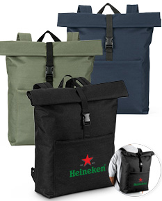 Mochila "Roll-top" para notebook em 600D e forro em 210D. Possui um compartimento principal espaçoso para notebook até 17.3", com fecho de enrolar no topo. Bolso frontal com zíper.