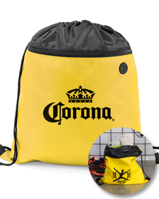 Sacola tipo mochila em poliéster 210D, resistente e prática, com bolso frontal com zíper e saída para fones de ouvido ou cabos. Ideal para organização de objetos pessoais, combina funcionalidade e estilo, sendo perfeita como brinde corporativo moderno e útil no dia a dia.