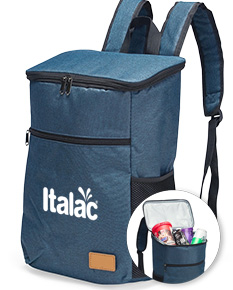 Mochila térmica confeccionada em poliéster catiônico 300D resistente à água e capacidade máxima para até 18 litros. Possui revestimento térmico em PEVA atóxico no compartimento principal, além de um bolso frontal com fechamento em zíper, dois bolsos laterais em espuma com elástico, duas alças para as costas e uma alça de mão em nylon. Acompanha plaquinha em couro sintético fixada com velcro.