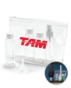 Necessaire Plástica em PVC. Incluso 3 frascos (2 x 65 ml e 60 ml), 1 vaporizador (80 ml) e 1 funil. Apropriada para transporte em cabine de avião